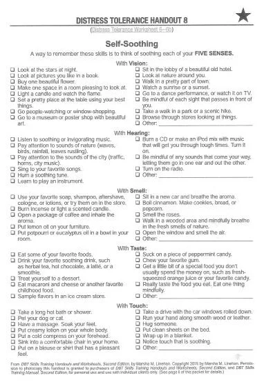 Here is a graphic pulled from Marsha Linehan's most recent book on DBT. A handout for you to use that gives some wonderful suggestions on ways to self-soothe.