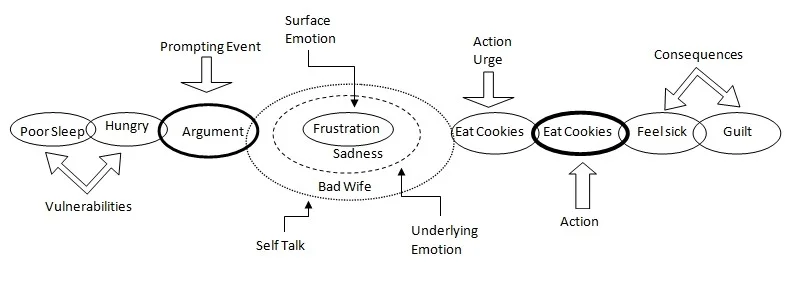 Let’s take an undesired behavior that many of us struggle with—eating too much unhealthy food. To make the example clearer, I’m going to say that the behavior was overeating some cookies. That is going to be our “action”. Now we can back up a bit and start looking at what came right before we decided to eat the cookies. For the purposes of this example, let’s say that right before I ate the cookies, I had a fight with my husband. That might be a “prompting event”. In DBT, we’re very interested in looking at vulnerabilities, so we want to look at what my vulnerabilities were even before I had the argument with my husband. Let’s say I didn’t sleep well the night before and I skipped breakfast. Now we can start filling in the “chain” to get a visual example of what happened: